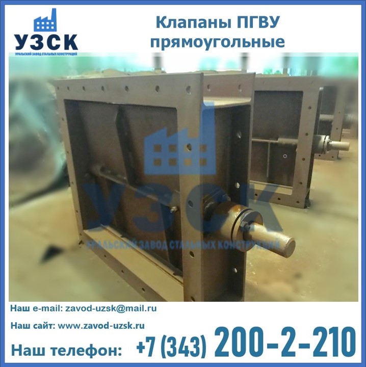 Прямоугольный клапан ПГВУ имеет прямоугольную или квадратную форму, по основному сечению конструкции, на которую устанавливается клапан. Для изготовления в Костанае применяются сталь или чугун, в зависимости от модели. Внутри клапана имеется запорный элемент, передвигающийся параллельно общему потоку движения среды. Шибер ПГВУ имеет такую же форму, как и основное сечение. Перемещение створки происходит благодаря возвратно-поступательным движениям.